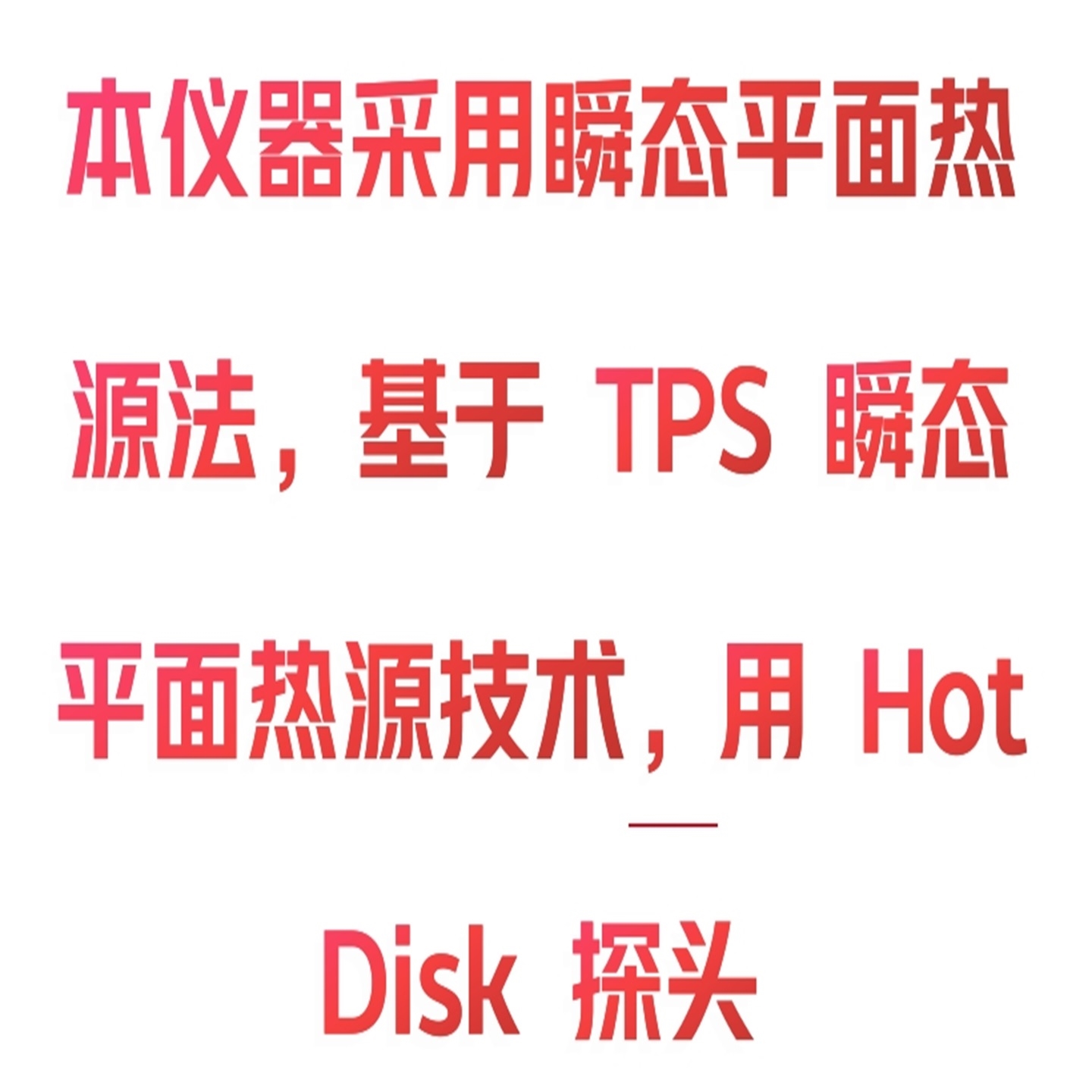 本仪器采用瞬态平面热源法,基于 TPS 瞬态平面热源技术,用 Hot Disk 探头 设备参考标准:ISO 22007-2:2008, GB/T32064-2015 。 测试材料: 金属、合金、石墨、导热硅脂、硅胶、硅橡胶、陶瓷、岩土、岩石、聚合物、纸、 织物、泡沫塑料、混凝土、复合板材、纸蜂窝板等固体、粉末、液体、糊状、涂层、薄膜、保温材料、绝热材料、各向异性材料等的导热系数、导温系数(热扩散系数)和比热容、蓄热系数及热阻。