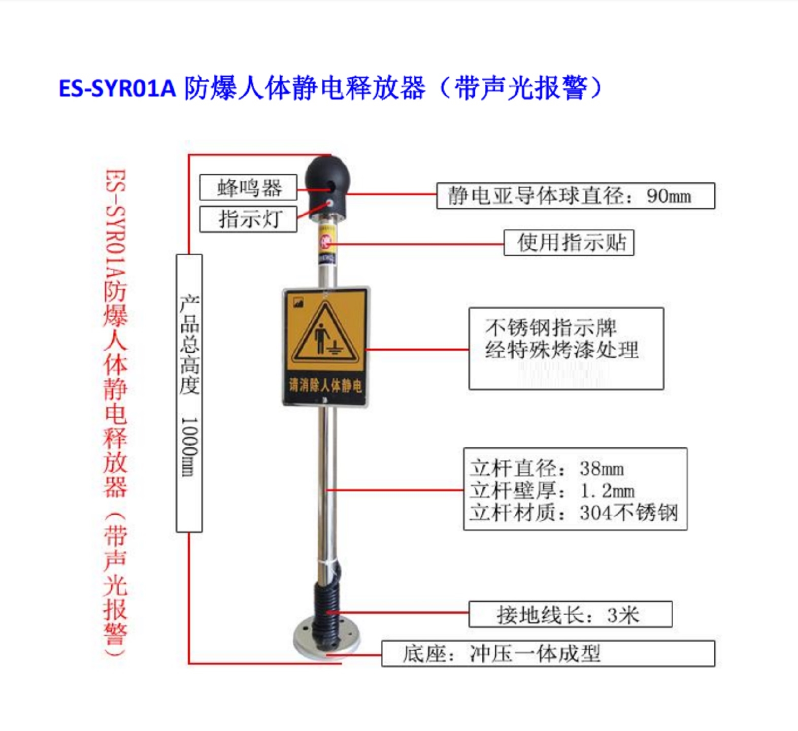 详细参数: 1、立杆材质:304 不锈钢 2、立杆直径:Φ38mm 3、立杆壁厚:1.2mm 4、产品高度:立式:1000mm,或壁挂式,台式 5、触摸球直径:Φ90mm 6、安装法兰壁厚:3.0mm 7、接地电缆长度:3m 8、触摸球材质:静电亚导体 9、报警方式:声光报警/语音报警 10、泄漏电阻:10^5-10^9Ω 11、接地电阻:<100Ω 12、休*眠电流:<1mA 13、工作电流:<5mA 14、工作温度:-20℃-40℃ 15、耐静电压:±20KV 16、工作电源:高性能锂电池 3.6V 17、响应时间:<1 秒 18、防爆标志:Ex ia IIC T6 Ga; 19、标示牌:180mmX240mm(宽 X 高) 20、标示牌壁厚:1.0mm