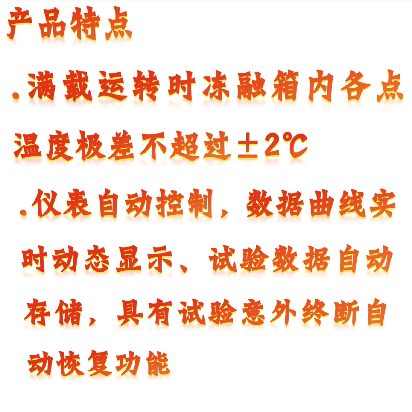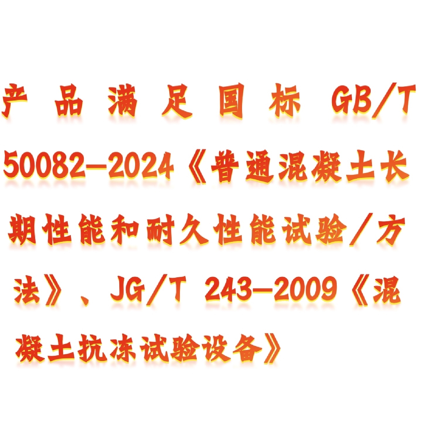 产品简介 本产品适用于测定混凝土试件在水冻水融的条件下,经受的快速冻融循/环次数或抗冻耐久性系数来表示的混凝土抗冻性能。产品满足国标GB/T 50082-2024《普通混凝土长期性能和耐久性能试验/方法》、JG/T 243-2009《混凝土抗冻试验设备》、ASTM C666 《混凝土快速冻融能力的标准试验/方法》、DL/T5150-2017《水工混凝土试验规程》、SL/T352-2020《水工混凝土试验规程》、JTG3420-2020《公路工程水泥及水泥混凝土试验规程》、JTJ270-1998 《水运工程混凝土试验规程》 等标准。 产品特点 1.压缩机、加热部分、电源控制部分均采用进口件 2.满载运转时冻融箱内各点温度极差不过±2℃ 3.仪表自动控制,数据曲线实时动态显示、试验数据自动存储,具有试验意外终断自动恢复功能 4.安装方便,占地小,低噪音 技术参数 冷凝器冷却方式风冷 试件数量16件 试件尺寸100×100×400,测温件尺寸相同, 中间留有测温孔 冻融循/环周期2.5~4小时,融化时间不小于1∕4冻融周期 传感器1:中心温度控制5~-18±2℃ 传感器2:液体温度控制液体温度控制高温控制:18~23℃ 低温控制:-23~-18℃ 传感器3:对角线温度控制对角线温度监测箱体内温度极差不过2℃ 传感器4:二次保护温度控制50℃~-30℃ 温度记录仪触摸屏 冻融循/环介质-45℃防冻液 冻融循/环介质充注量液面高于试块10-15mm 制冷机压缩机5HP 加热功率4kW zui大运行功率5kW 供电3N380V 50Hz 外形尺寸1760×900×1100mm